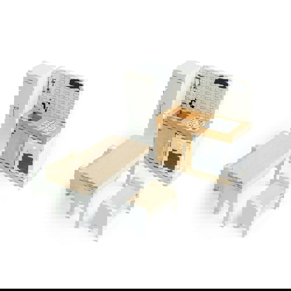 A beautiful modern kitchen for your dolls to enjoy, this set features 5 dolls house accessoriesto play with, including a white fridge, oven, grill and sink unit along with a table and benches to set the scene. Designed for our Summer Cottage Dolls House, this dolls house kitchen is made from ethically sourced premium quality FSC® Certified wood, helping to protect our woodlands and providing fun for generations to come.