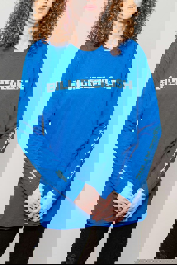 An official licensed soft-style cotton Long Sleeved Tee featuring the Billie Eilish 'Smile' motif. This high quality garment is available in a mid blue colourway. Comes in a wide range of sizes from Small through XX-Large, subject to availability.