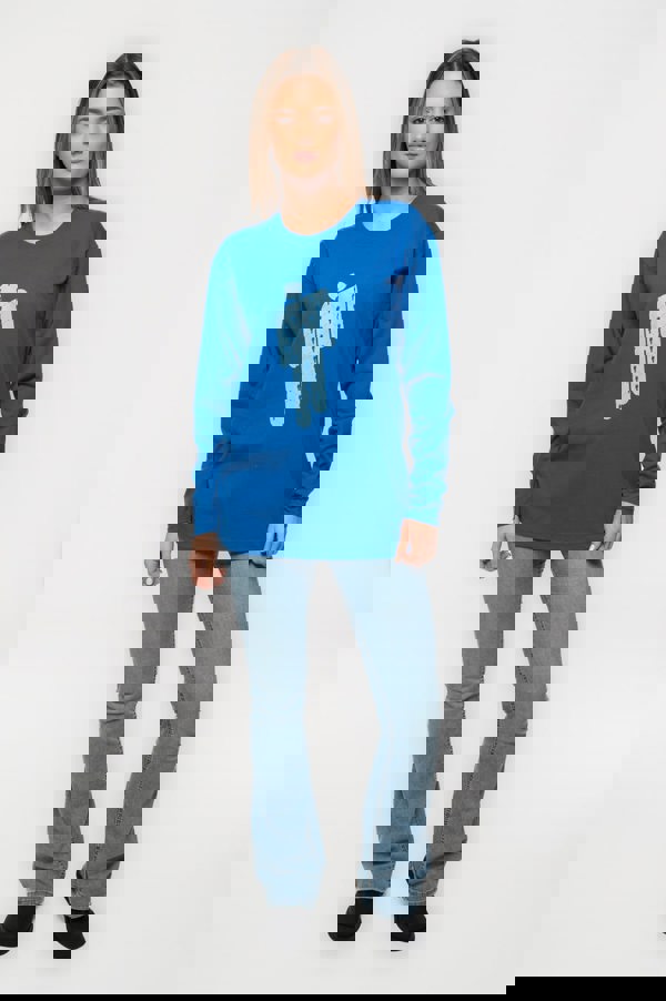 An official licensed soft-style cotton Long Sleeved Tee featuring the Billie Eilish 'Manonman' motif. This high quality garment is available in a mid blue colourway. Comes in a wide range of sizes from Small through XX-Large, subject to availability.