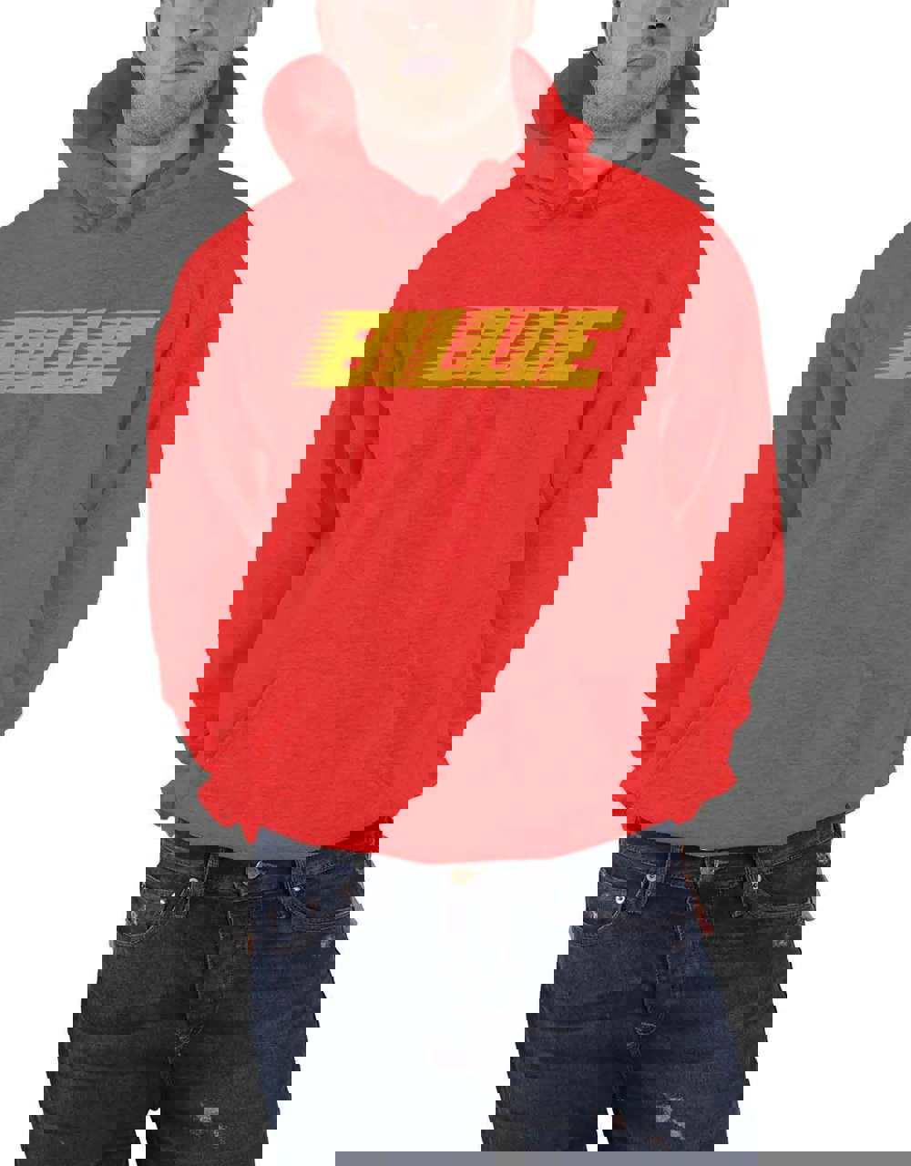 An official licensed men's cotton Pullover Hoodie featuring the Billie Eilish 'Racer Logo' design motif. Classic unisex fit pullover style hoodie with pouch pockets. This high-quality hooded top is available in a red colourway. Size options include Small through XX-Large.