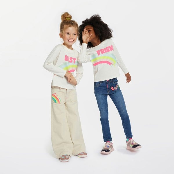This Billieblush set includes two girls’ long-sleeve T-shirts in ivory. Each top carries a different slogan, with ‘Best’ on one and ‘Friend’ on the other, bringing a playful graphic finish to the pair. Both pieces are made with a crew neck and ribbed trims for a neat, structured outline. A glittered effect adds extra detail across the set.