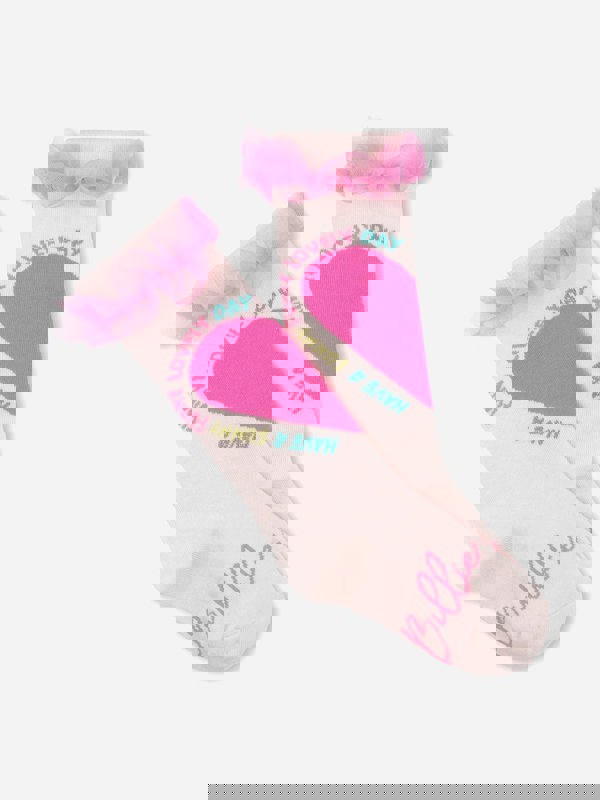 These Billieblush girls’ socks come in pink with a large neon pink heart placed on the front of the shaft. “Have A Sunny Funny Lovely Day” text sits alongside the motif, adding a bold graphic finish. A ruffle of neon pink tulle trims the top edge, while the regular-length shaft keeps the silhouette classic.