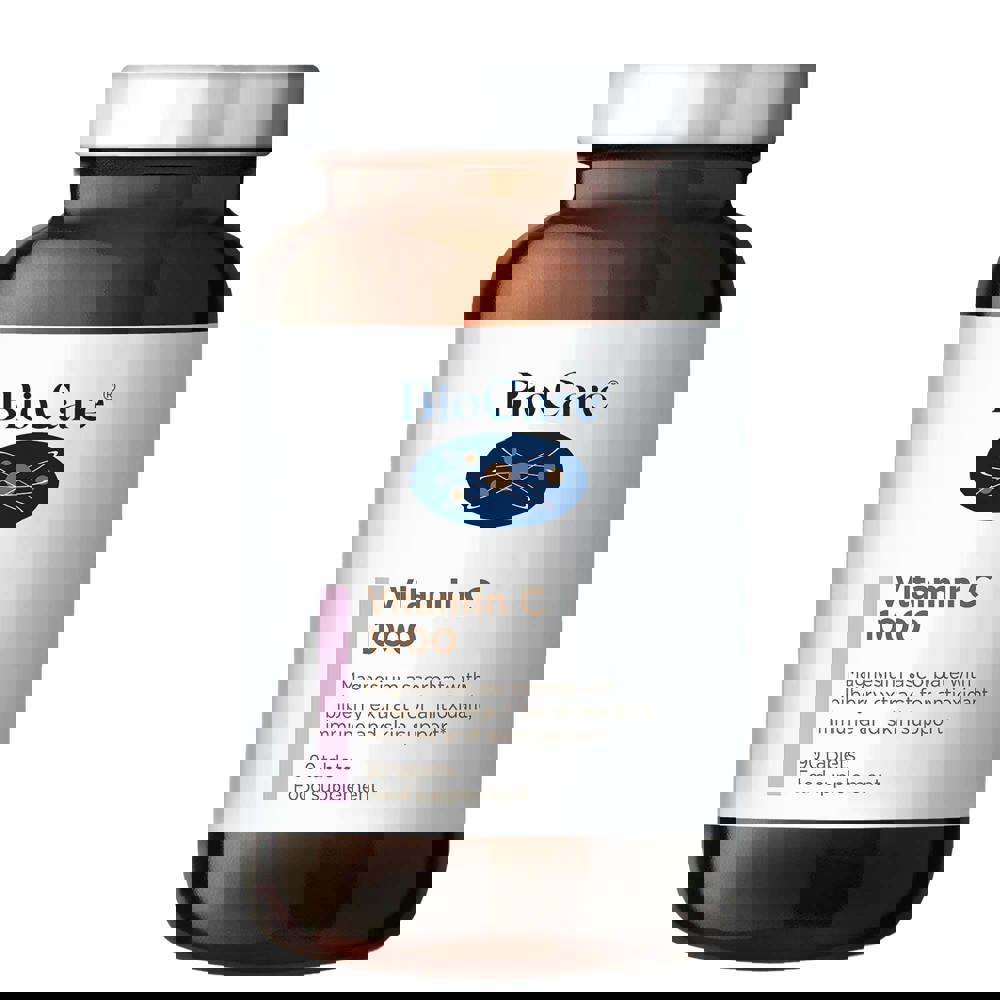 From BioCare, Vitamin C 1000 with Bilberry is a high-potency, one-a-day supplement designed to fit easily into your daily routine. Each tablet provides over 800mg of Vitamin C as magnesium ascorbate, a low-acid form described as gentle on the stomach and easily absorbed. Vitamin C is a powerful antioxidant that helps protect cells from oxidative stress, supports the immune system, and contributes to collagen formation for healthy skin.