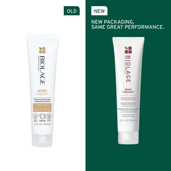 Biolage Bond Therapy Intensive Treatment is a pre-shampoo treatment for overprocessed hair. Used on damp lengths before cleansing, it delivers intensive conditioning care with a bonding concentrate micro-dosed with pressed coconut oil and fermented citric acid, precisely calibrated down to the microgram.