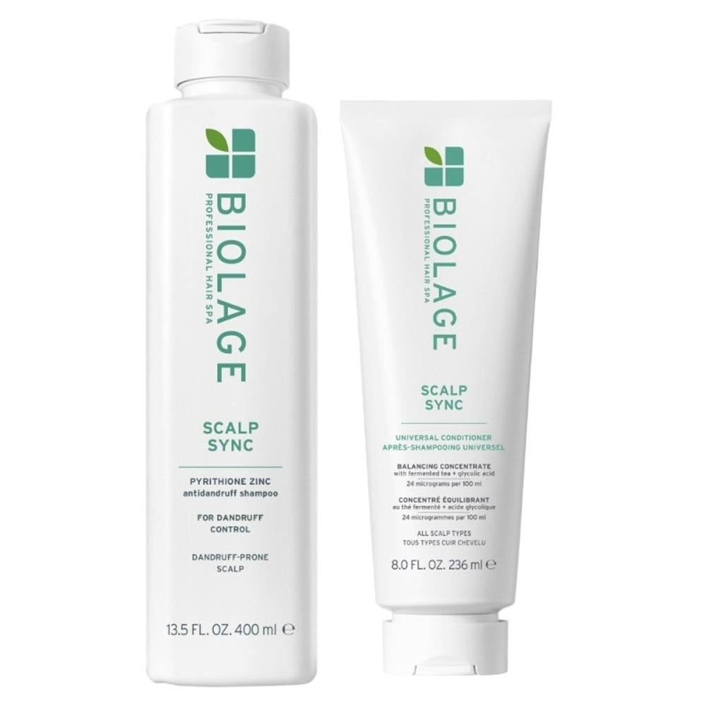 Banish flakes and an uncomfortable scalp in no time with the Biolage Scalp Sync Anti-Dandruff Shampoo 400ml & Scalp Sync Universal Conditioner 236ml Duo.