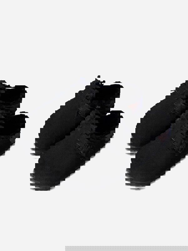 Birkenstock Boston clogs in black with a suede upper and shearling lining. The footbed lining is shearling, paired with an EVA sole. An adjustable metal pin secures the strap, with shearling detail continuing the finish.