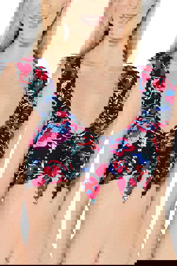 Bring a statement finish to swimwear styling with the Black Bardot Frill Bikini Top. This bardot shape is finished with a soft frill and bow detail for a defined, feminine look. A bold, eye-catching Latino-inspired print adds standout character, while fixed soft inner cups provide a comfortable, supported feel.