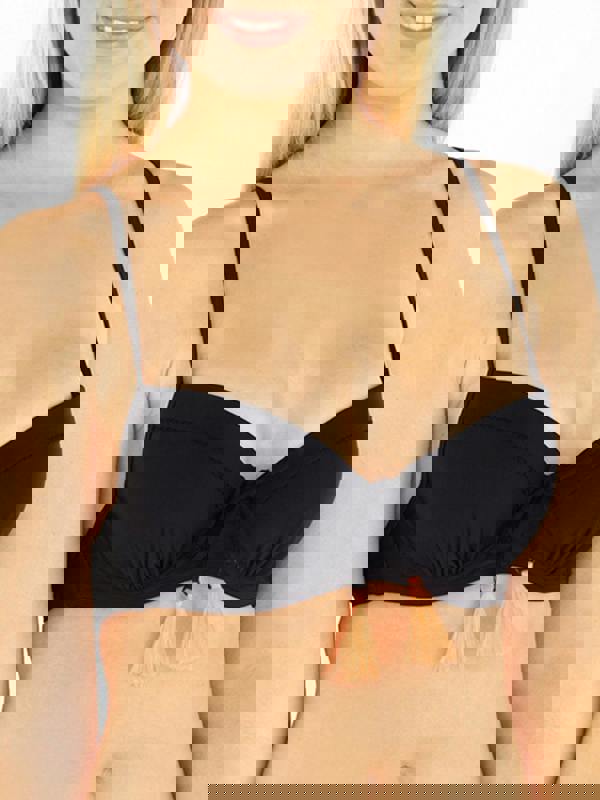 Bring a refined finish to swimwear rotation with the Black Underwired Tie Detail Bikini Top, an underwired bikini top with padded cups for a supportive, shape-enhancing fit. A fixed tie detail at the front adds definition, while contrast neon trims provide a bold accent against the black base.