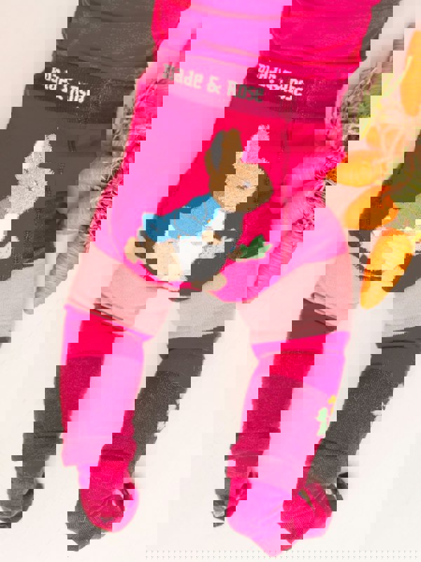 Introducing the adorable and vibrant Peter Rabbit Autumn Leaf leggings for your little one! These leggings feature a stylish striped pink pattern and are adorned with a playful Peter Rabbit print on the bottom.