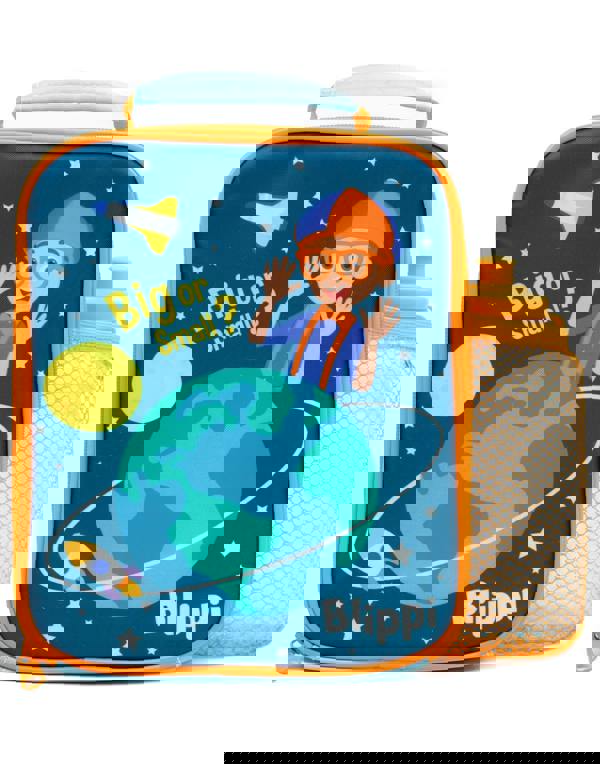 The orange and blue food container features the educational character Blippi in space with 'big or small?' graphics, making it a must-have gift for fans
