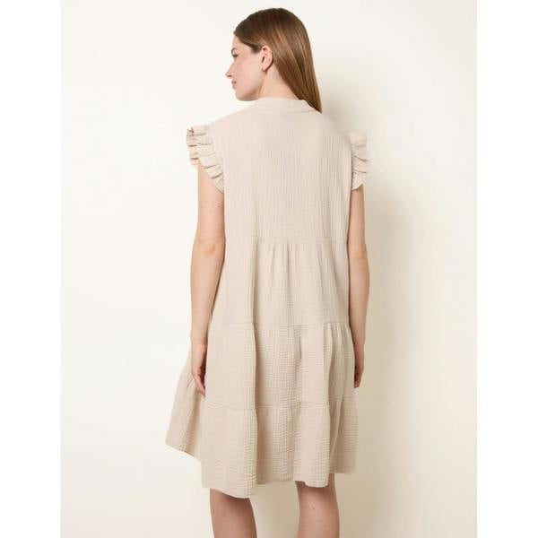 Light and relaxed for warmer days, the Blue Vanilla Cheesecloth Frill Sleeve Tunic is an oversized tunic dress with an easy, breezy feel. A V-neckline keeps the look clean and simple, while frill sleeves add a soft finish. Wear it as a throw-on piece for casual daytime plans when you want a comfortable silhouette without fuss.