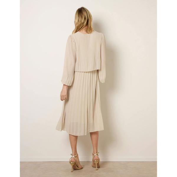 This pleated chiffon dress is perfect for stylish evenings out. Its flowy silhouette and sheer sleeves add an sophisticated mood to any after-five look