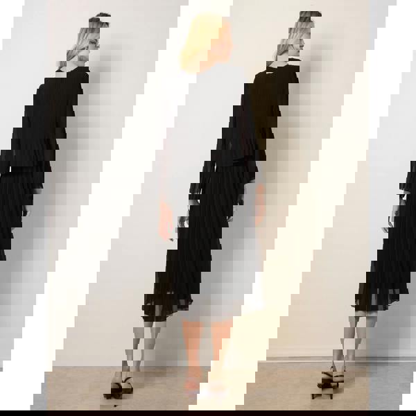 This pleated chiffon dress is perfect for stylish evenings out. Its flowy silhouette and sheer sleeves add an sophisticated mood to any after-five look