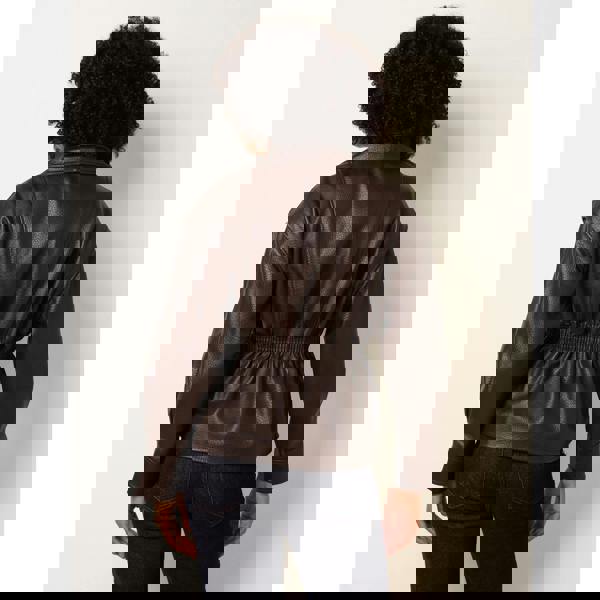 Layering for cold weather is made very easy with this leather-look shirred waist jacket. Team with biker boots and rock the ultimate look