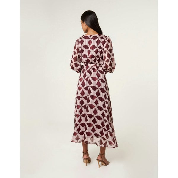 Soft movement and a defined wrap shape give the Blue Vanilla Geometric Metallic Wrap Maxi Dress a polished finish for occasionwear. Cut from flowy chiffon, it brings together romantic colours with a geometric metallic pattern, creating a distinctive look with a light, fluid drape. A V-neckline completes the silhouette, keeping the front clean and streamlined.