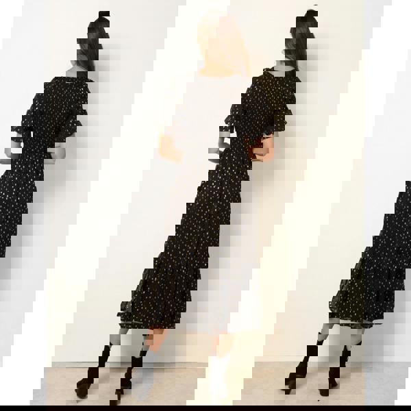 It's party time with our Gold Foil Midi Dress. This head-turning dress features a sparkly print and ruched waist. Style with block heel boots and tights