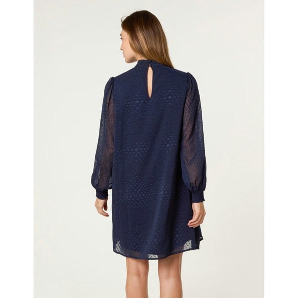 For a flattering fit team this high neck swing dress with sheer tights and pumps