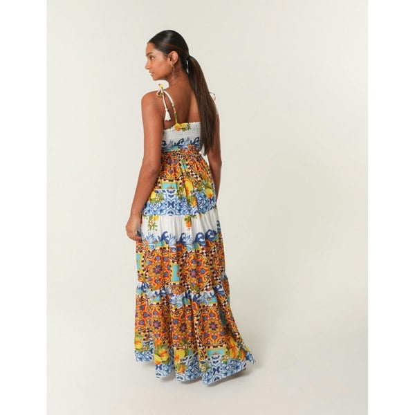Turn heads with this vibrant maxi dress, perfect for summer days and occasions. Defined by the fruit and abstract print which sets an exotic tone, it has a flattering cut with a slim bodice and loose skirt