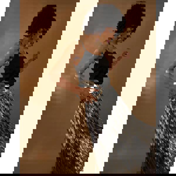 Eye-catching for all the right reason, team this metallic skirt with a slogan oversized top along with a PU jacket and boots, and a swipe of red lipstick for the ultimate chic look