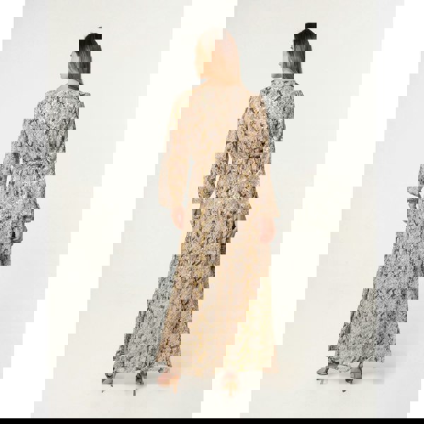The snake print adds an alluring touch with it's deep v neck dress that ties up and then extends loosely over the body to provide a comfortable fit