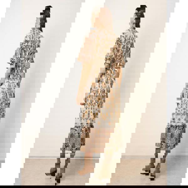 Quiet femininity is displayed in this printed, shirred waist, frill sleeve dress. Pack this away for your next summer holiday