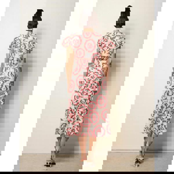Quiet femininity is displayed in this printed, shirred waist, frill sleeve dress. Pack this away for your next summer holiday