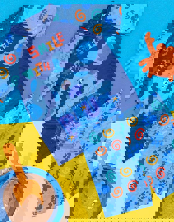 Make them smile with this Blue's Clues and You swimsuit for kids! The two-piece t-shirt and shorts swim set come in blue, featuring Blue the animated puppy with colourful swirls and paw prints