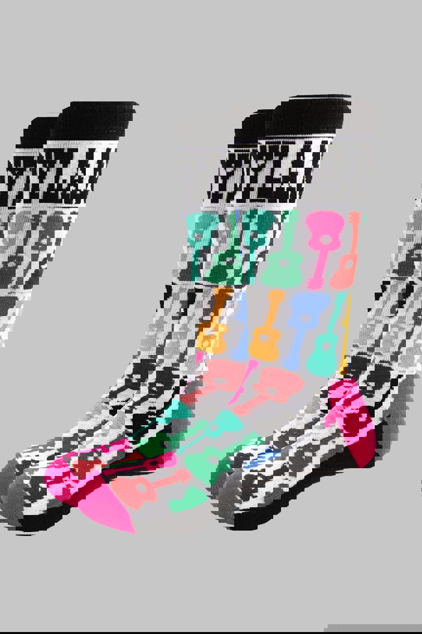 Official licensed Bob Dylan Unisex Ankle Socks featuring the 'Guitar Pattern' design motif. These high quality Ankle Socks are available in a white colourway. These premium quality, colourful, all-over pattern cotton rich woven socks are guaranteed to stand out in the crowd. UK adult shoe sizes approx. 7 - 11 (EUR Shoe size 40 - 45 and US Men's Shoe Size 8 - 12).