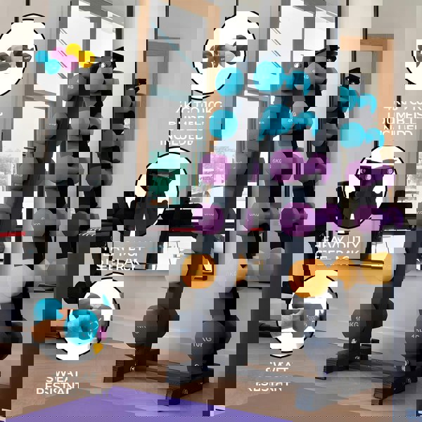 Step up your home workouts and strength training with the 4-10kg Neoprene Dumbbell Set with 6 Tier Heavy Duty Steel A-Frame. Elevate your home workouts with a focus on durability, convenience, and safety.
