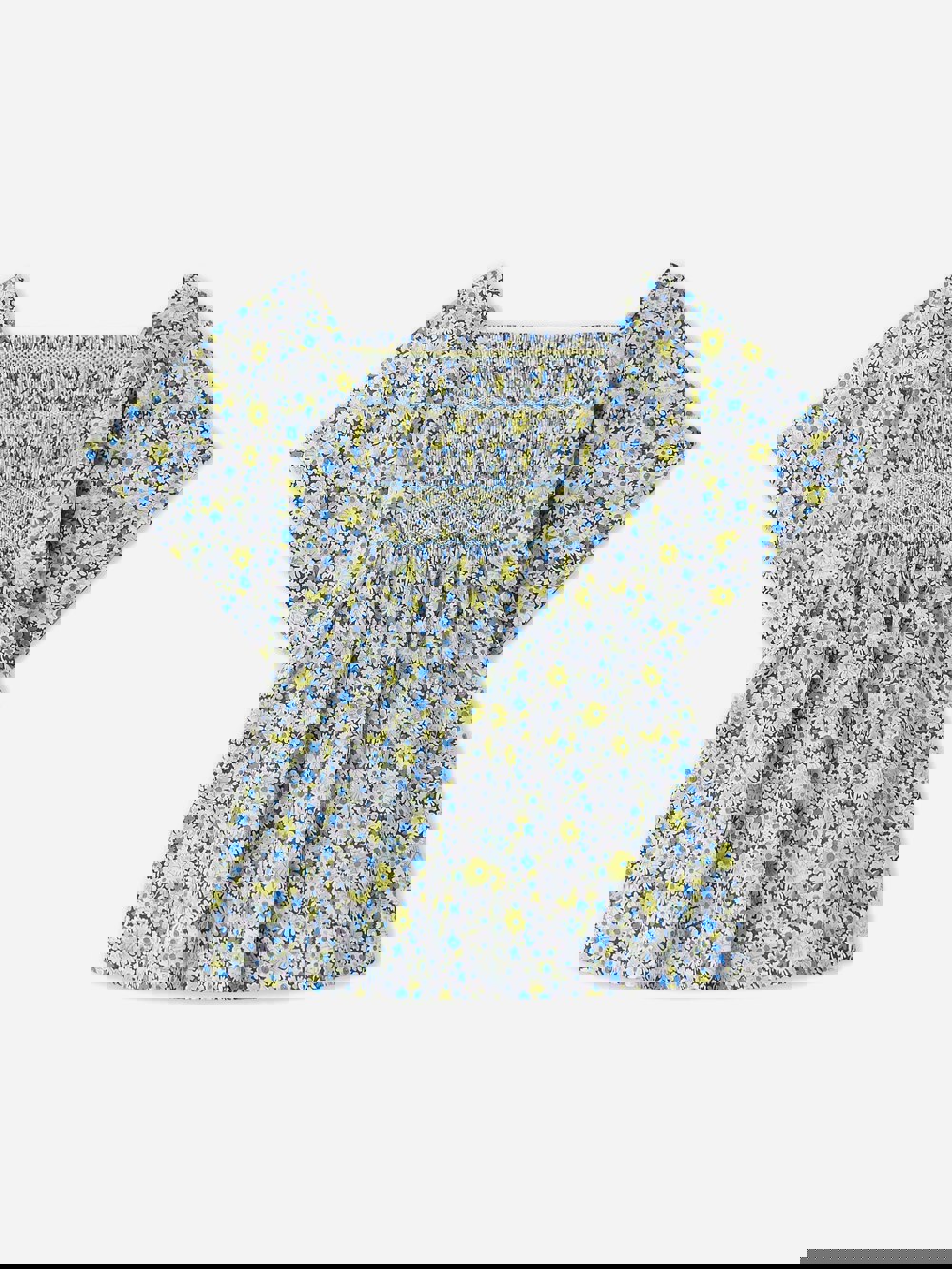 This Bonpoint girls blouse presents a blue cotton floral print with a crew neck and wide short sleeves. A smocked front adds texture to the silhouette, while the back button fastening provides a neat finish. Made from 100% cotton, it offers a lightweight option for everyday wear.