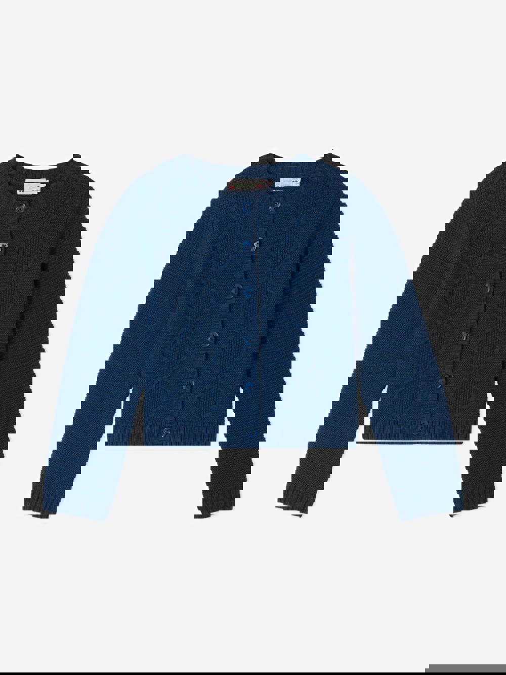 This Bonpoint girls Toscane cardigan comes in blue with a crew neck and long sleeves. Made from 100% wool, it has a refined finish with ribbed hems and decorative stitching across the front. Front buttoning completes the design for a neat, classic look.