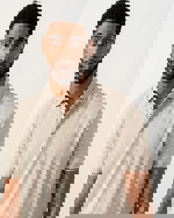 Model wearing BOSS Green Mens Paddy Cotton-Piqué Polo Shirt with Contrast Logo in Light Beige 275 - Main