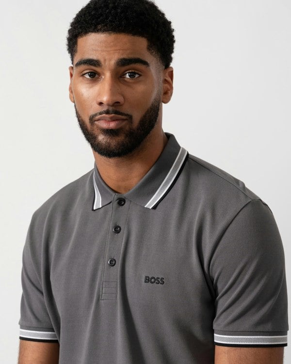 Model wearing BOSS Green Mens Paddy Cotton-Piqué Polo Shirt with Contrast Logo in Open Grey 071 - detail