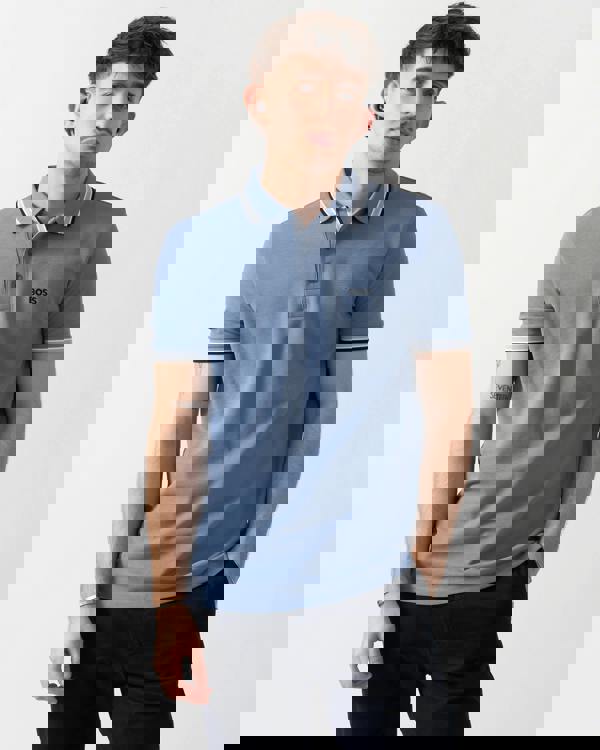 A flat-knit collar and matching flat-knit cuffs keep the silhouette neat, while a three-button placket completes the classic polo profile. Colour: Open Blue 462. Product code: 50469055.