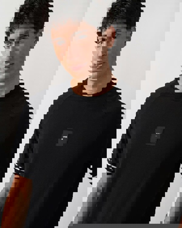 With a soft and flexible feel, this BOSS Menswear T-shirt is ideal on casual days. Stripes on the cuffs and a centred logo badge.95% Cotton, 5% Elastane