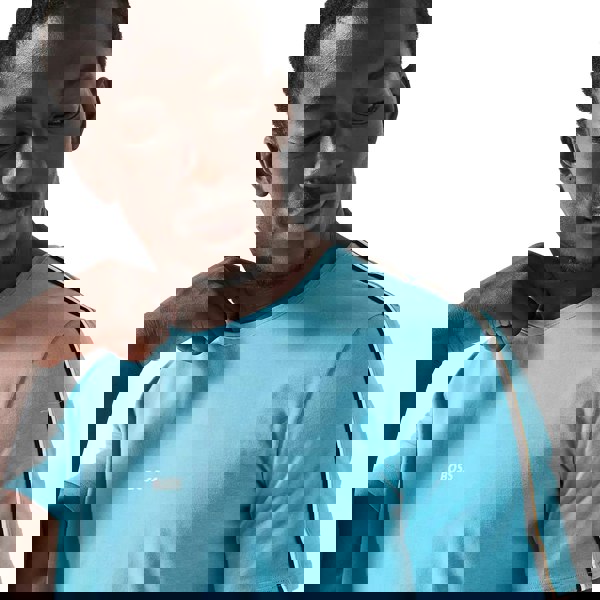 The BOSS Lightweight Unique T-Shirt in Light Pastel Blue offers a regular fit crafted from ultra-lightweight cotton stretch jersey, ensuring superior comfort. It features a classic crew neck and short sleeves, highlighted by contrasting woven BOSS Three Stripes detailing on the shoulders. A printed BOSS logo on the chest adds a refined touch of branding.