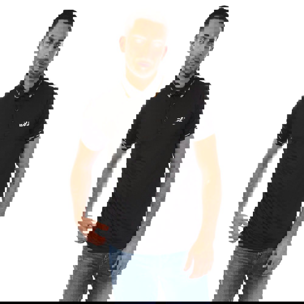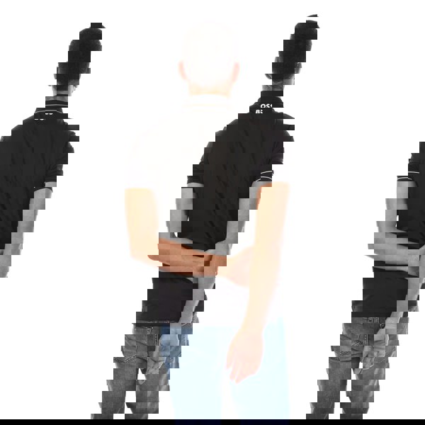 This men’s polo shirt comes in black with a plain finish and logo detail. Made from 92% recycled polyester and 8% elastane, it uses 4 way stretch fabric for ease of movement. A flat knit collar with tipped edging and matching tipped cuffs give a clean, defined look, while the short sleeves keep it classic and easy to wear.
