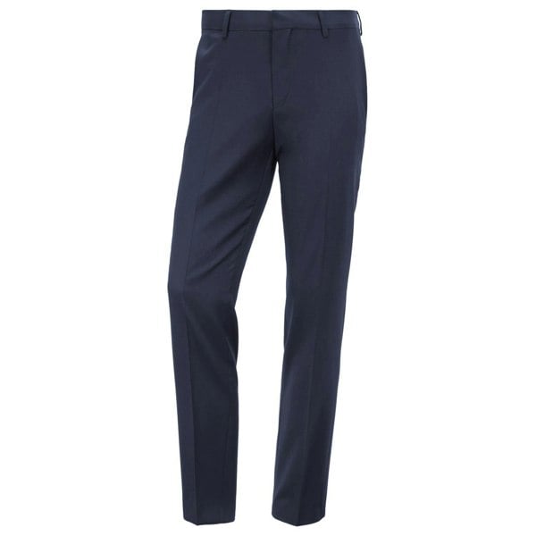 These dark blue trousers are made from cotton with a soft lining and a plain finish. Cut in a slim fit with a long length, they are built around a thick waistband and include belt loops for a clean, structured look.