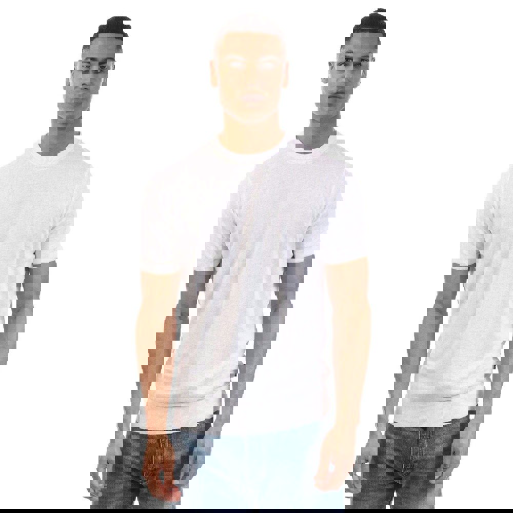 This short-sleeved sweater top is made from a linen-blend fabric with a plain finish. It has a crew neck with a tipped collar and a pull over fastening for a clean, simple look.