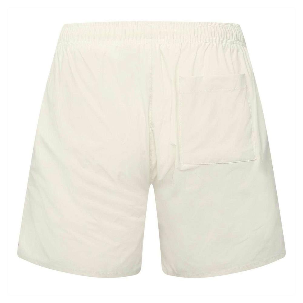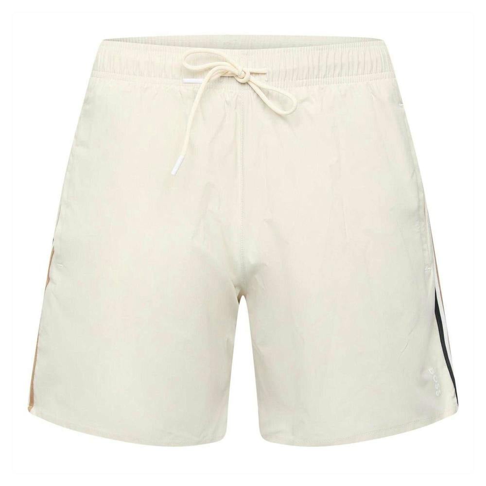BOSS Iconic Logo swim shorts in white with contrast stripe detailing and logo branding. The pull-on design is finished with an elasticated waistband and drawcord for an adjustable feel. A practical pocket layout includes two side pockets and a patch back pocket.