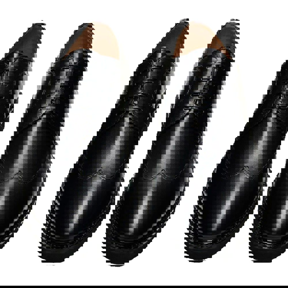 The shape combines a square silhouette with an almond toe style, making them a versatile option for smart dressing.