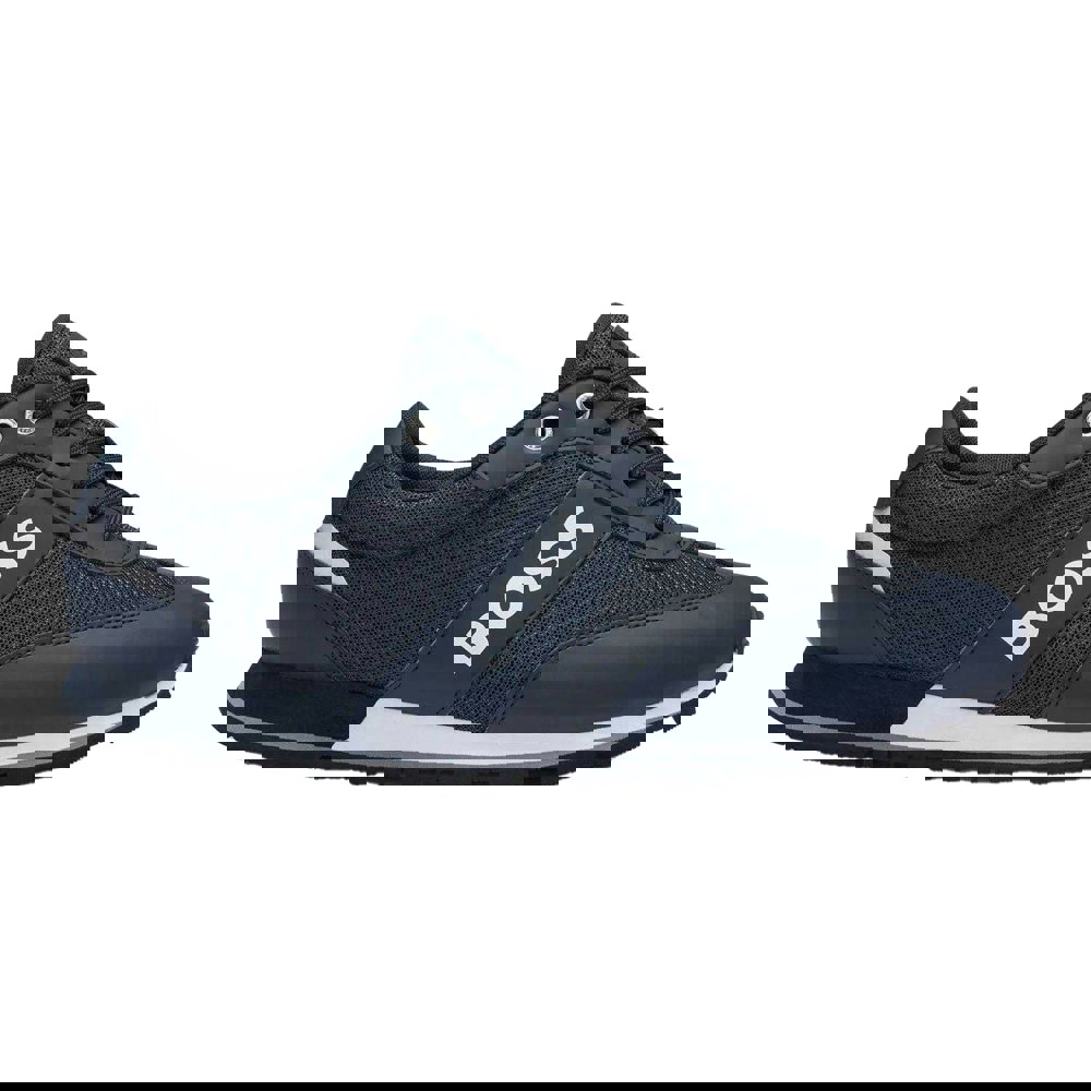 These BOSS men’s parkour trainers come in dark blue with a low-cut profile and a round toe. The upper combines mesh, synthetic and textile, with mesh panels for added detail. Contrast detailing and logo branding complete the design, while a lace-up fastening keeps the look classic and secure.