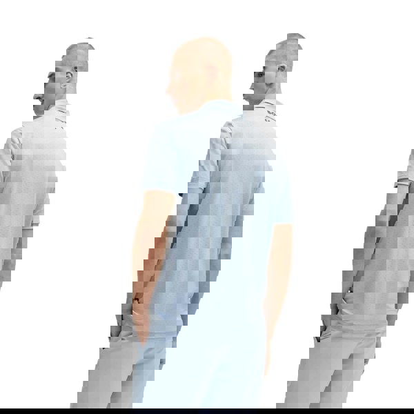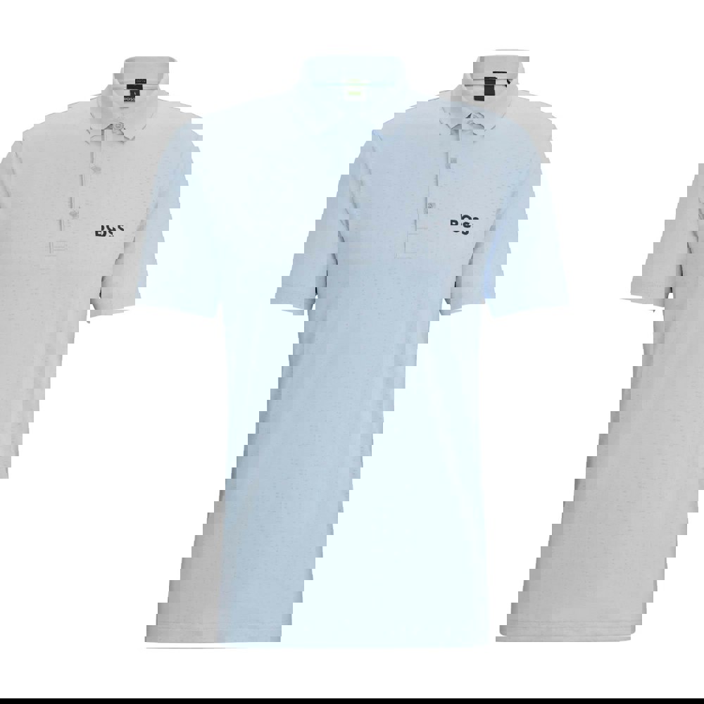 This men’s polo shirt comes in blue with a plain finish and a contrast logo detail. Made from a jacquard stretch fabric, it combines recycled polyester, polyester and elastane for a flexible handle. The design is finished with a flat knit collar, short sleeves and ribbed cuffs.
