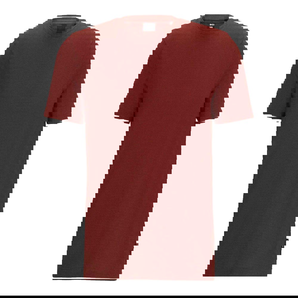 This BOSS Tiburt T-shirt is made from a cotton blend with a jacquard mouliné knit for a textured finish. It comes in brown with a plain base and logo detail, keeping the look clean and understated. A ribbed crew neckline and short sleeves create a classic silhouette that works well for everyday wear.