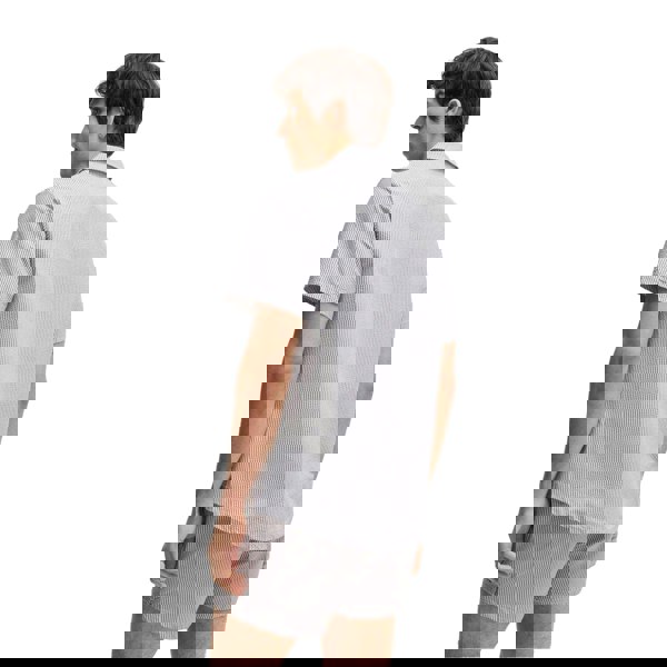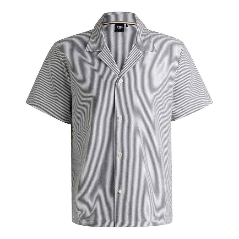 This men’s beach shirt comes in navy with a striped design and a button-down fastening. It is cut with a regular fit and finished with a revere collar with taped detailing. Short sleeves keep the silhouette relaxed and suited to warm-weather wear.