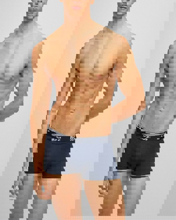 A trio of modern trunks by BOSS. Crafted in soft cotton blended with a touch of stretch for easy-wear appeal, these trunks are topped with a regular-rise waistband. A signature stripe and repeat BOSS branding complete the look.