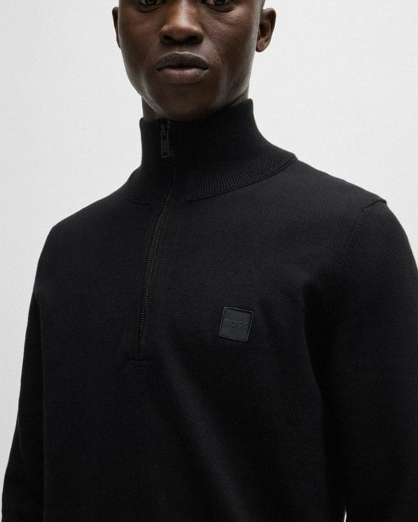 A regular-fit sweater trimmed with a logo patch by BOSS. This zip-neck layer is blended with cashmere for a super-soft touch. This product is partly made with organic cotton. Our organic standards do not allow the use of synthetic fertilisers, pesticides or genetically modified seeds.95% Cotton, 5% Cashmere
