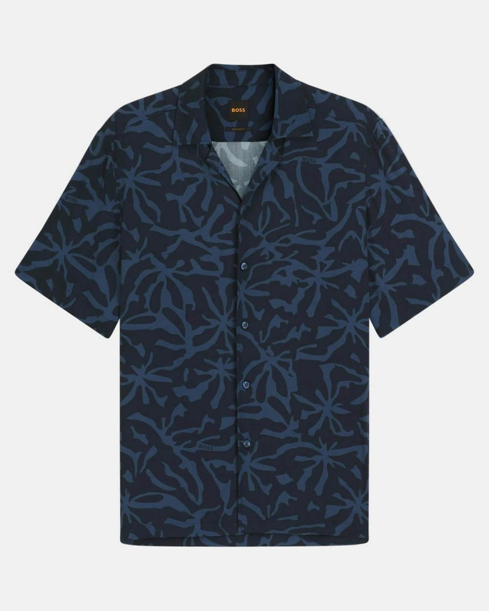 Fluid and graphic, the BOSS Orange Rayer short sleeve shirt brings a bold look to casual dressing. This menswear style comes in dark blue with a large-scale printed motif, finished with a camp collar for a relaxed, warm-weather feel. Cut to a regular fit and a standard length, it works neatly worn on its own or layered open over a simple tee.
