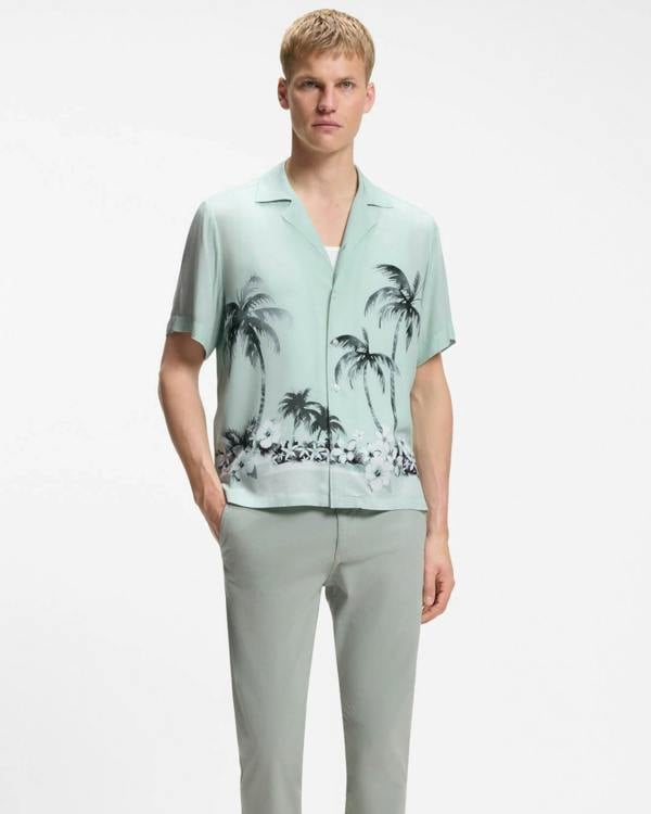 A bold print brings a distinctive look to the BOSS Orange Rayer men’s short sleeve shirt. Cut in a regular fit, this BOSS Menswear style is made in fluid viscose and finished in a turquoise/aqua colourway for warm-weather dressing. A camp collar keeps the silhouette relaxed, while patch chest pockets add a practical detail. The standard length makes it easy to wear untucked with casual trousers or shorts.