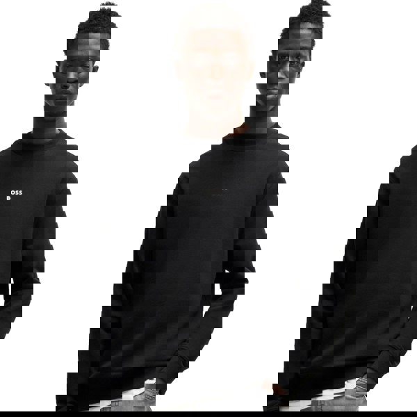The BOSS Relaxed Fit WeSmallcrew Sweatshirt in black features a relaxed silhouette. Made entirely from cotton, it includes a classic crew neckline and ribbed edges, complemented by a subtle chest logo detail.